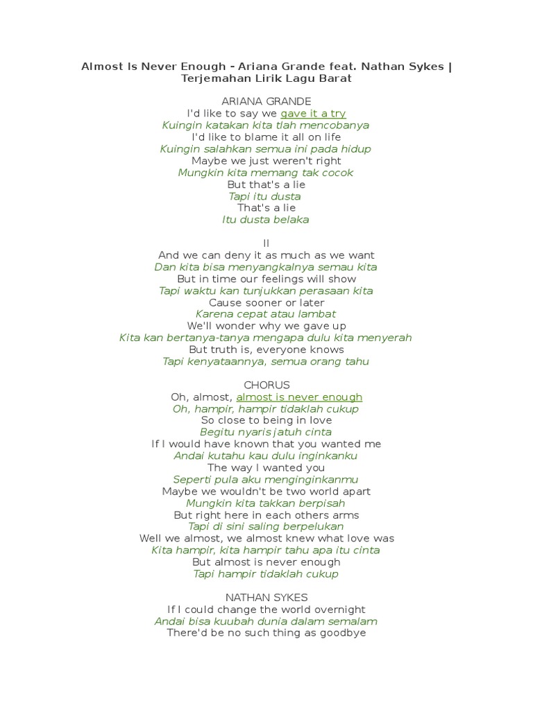Almost Is Never Enough Lyrics Terjemahan : .we almost, we almost knew what love waskita hampir, kita hampir tahu apa itu cintabut almost is never enoughtapi hampir tidaklah cukup if i could change the semua orang tahu oh, oh baby, you know, you know babyoh, oh kasih, kau tahu, kau tahu kasihalmost, is never enough babyhampir.