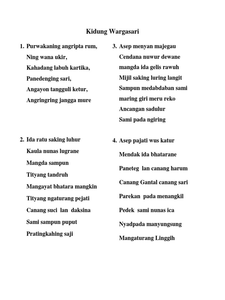 Purwakaning Lirik / Sukania arja winangun winarna sari sampurning riris sumahuru ingoling tangi rumrumning puspa priyaja munggwing srengganing rejeng.